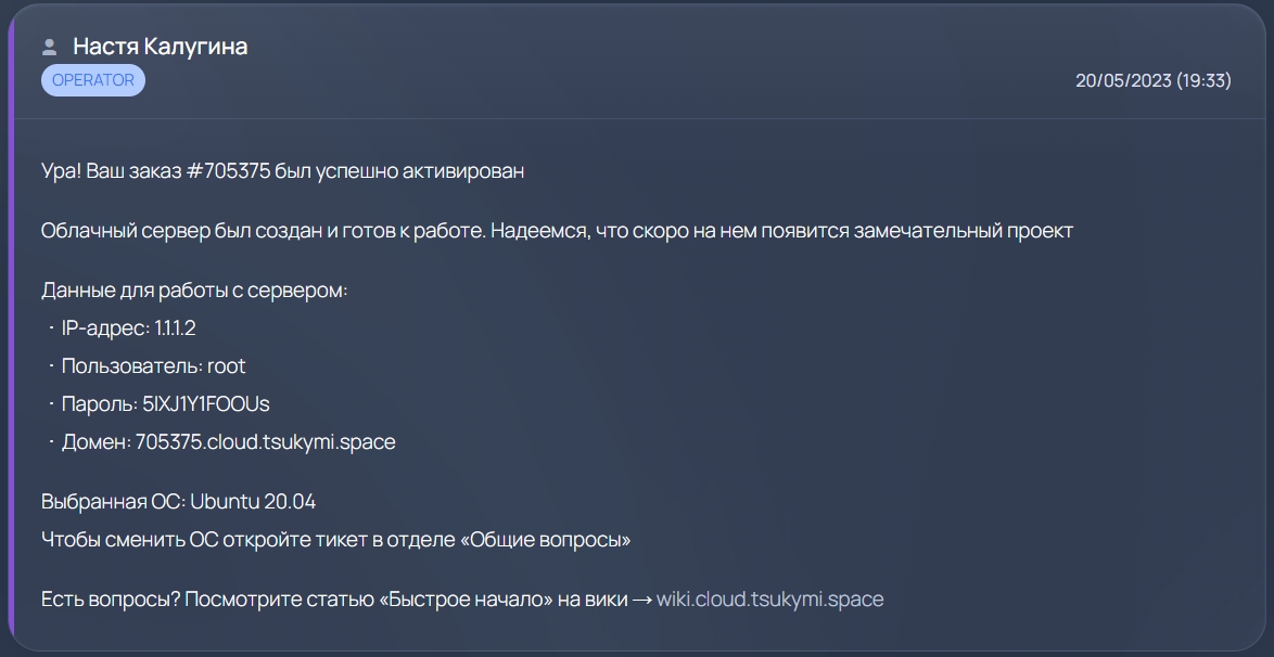 После оформления и активации заказа каждый клиент получает тикет с необходимыми данными для использования своего сервера.